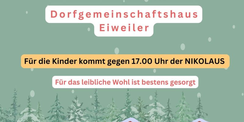 Am Freitag, dem 22. November, lädt die Dorfgemeinschaft herzlich zum diesjährigen Adventsmarkt ins Dorfgemeinschaftshaus Eiweiler ein. Die Veranstaltung beginnt um 15:00 Uhr und bietet allen Besucherinnen und Besuchern die Möglichkeit, in gemütlicher Atmosphäre in die Adventszeit zu starten.