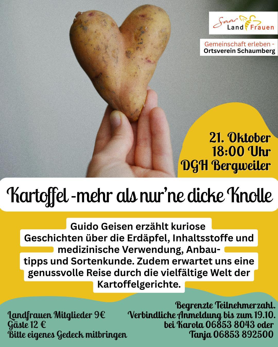 🥔🥔 Wir freuen uns auf einen spannenden Vortrag über die kuriose Geschichte der Erdäpfel, Inhaltsstoffe und medizinische Verwendung. Natürlich darf dabei eine Kostprobe von leckeren Kartoffelgerichten nicht fehlen. Schnell verbindlich anmelden, die…