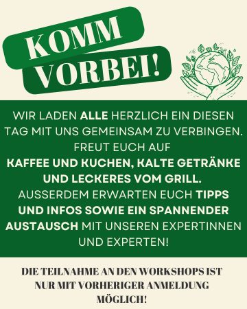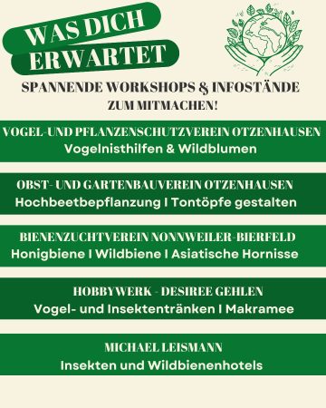 Freut euch auf spannende Workshops und Infostände für Kinder ab 5 Jahren (5-10Jahre mit erwachsener Begleitperson) rund um Natur, Garten und Insekten – mit vielen Tipps und Infos von Expertinnen und Experten aus der Region.