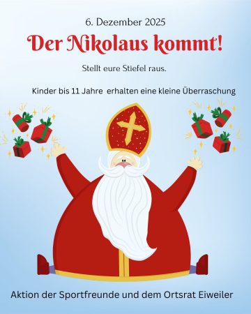 In diesem Jahr wird der Nikolaus wieder alle Kinder in Eiweiler bis zum Alter von 11 Jahren mit einem kleinen Geschenk überraschen. Freut euch also auf den 6. Dezember!