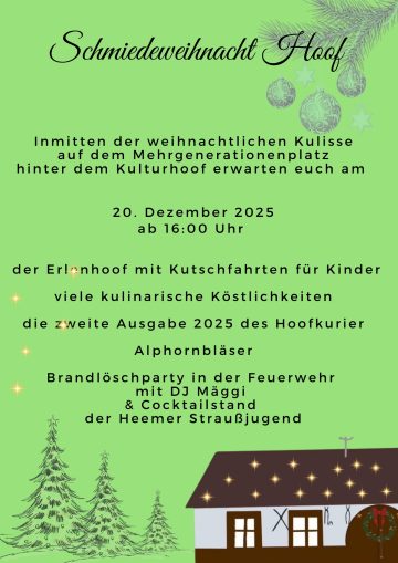 Veranstaltungen St. Wendel, Landkreis Hoof – Schmiedeweihnacht am 20.12.2025 Daniela Keller Posted on 18. Dez. 202518. Dez. 2025 Hoof