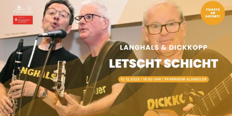 Traditionell beenden Langhals und Dickkopp in ihrer „Letscht Schicht“ das Kulturprogramm der Gemeinde Marpingen. Dieser feierliche Abschluss findet dieses Jahr am 12. Dezember ab 19:00 Uhr im Pfarrheim in Alsweiler…