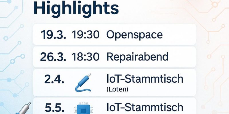 Los geht’s am 19.3. mit unserem OpenSpace-Abend ab 19:30 Uhr – hier ist Raum für Austausch und neue Ideen. Am 26.3. folgt ab 18:30 Uhr unser beliebter Repairabend.